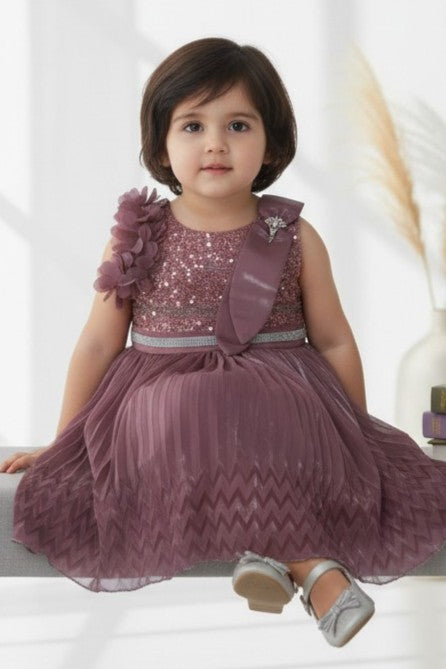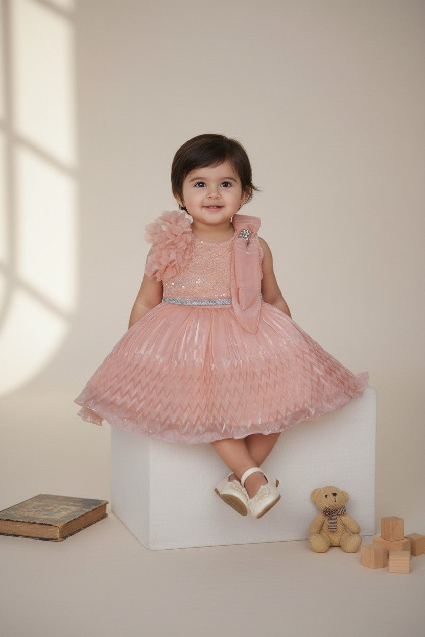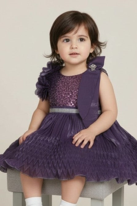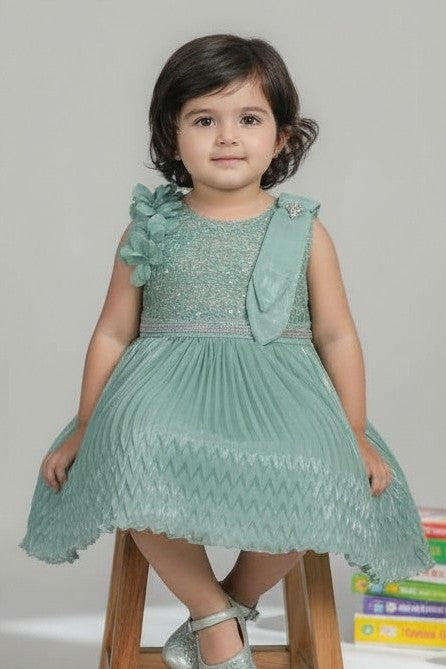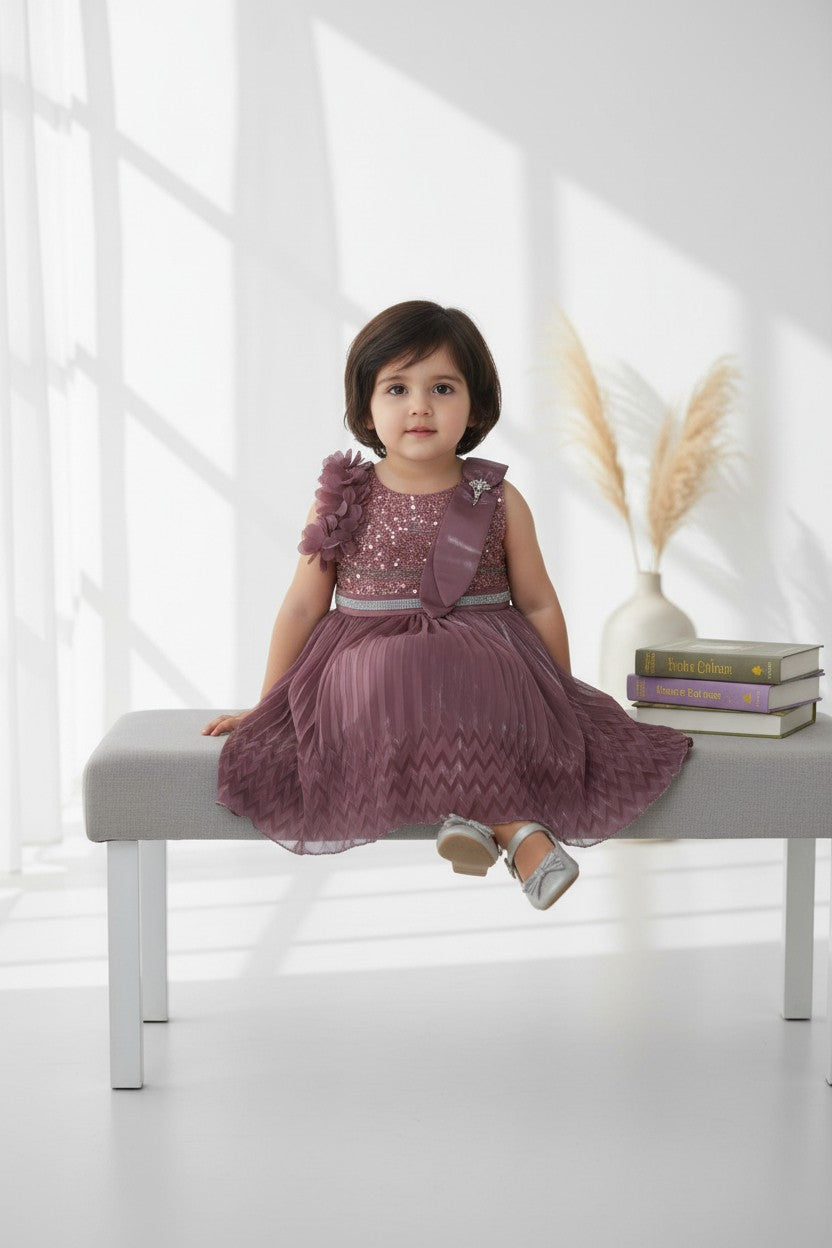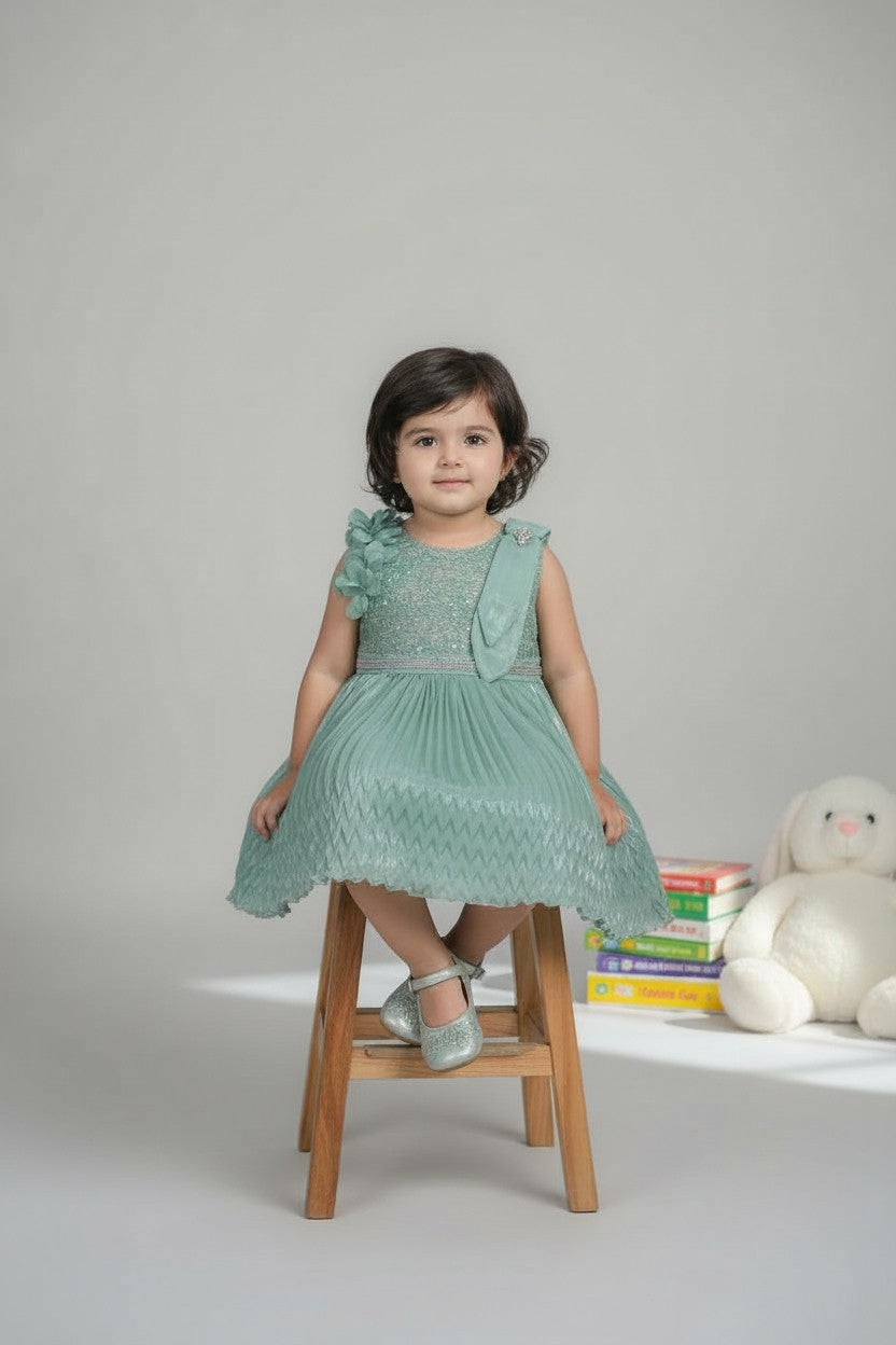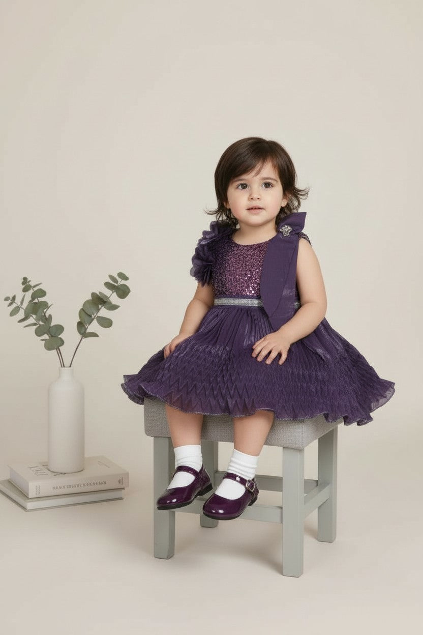 Let her shine effortlessly in this soft dreamy flair that blends shimmer with comfort. Pair it with embellished hair clips and belly shoes for a mini red-carpet moment.