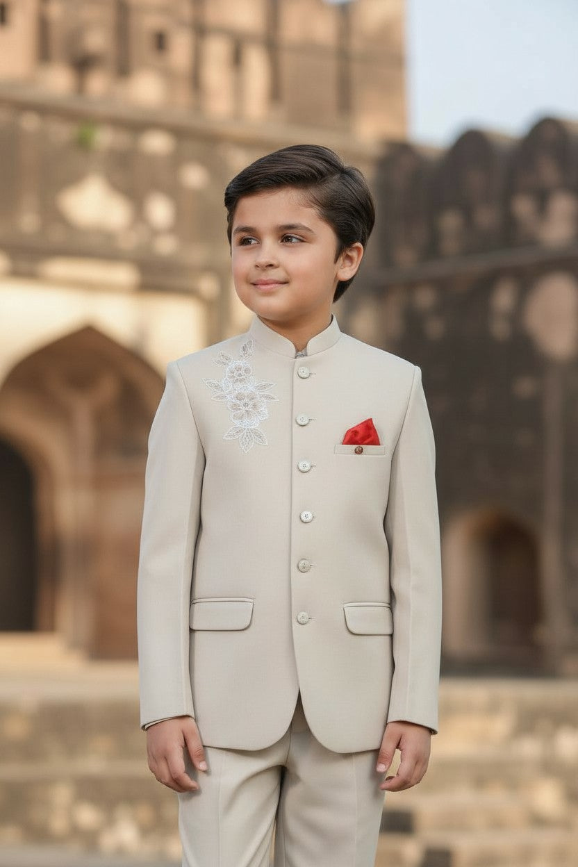 Emanate royal elegance in this Royal Jodhpuri Suit. The fawn shade infuses a touch of luxury, perfect for grand celebrations. The ensemble includes a suit, pant, and a coordinating pocket square, amplifying the regal allure. Ideal for your modern gentleman who appreciates traditional styles with a contemporary twist.
