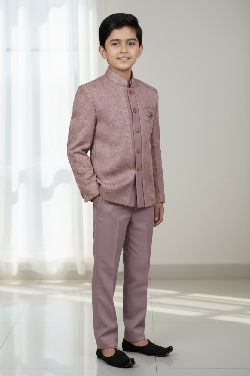 Bring out the charm in your stride with our graceful Indo Western set. Crafted from jacquard, the outfit injects an aura of royal sophistication. The ensemble includes an Indo, pant, and pocket square, ideal for any special occasion. Let your style speak on your behalf with this elegant attire.