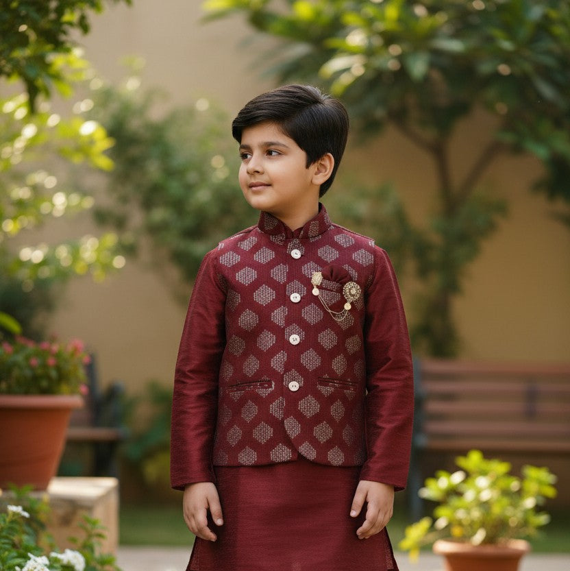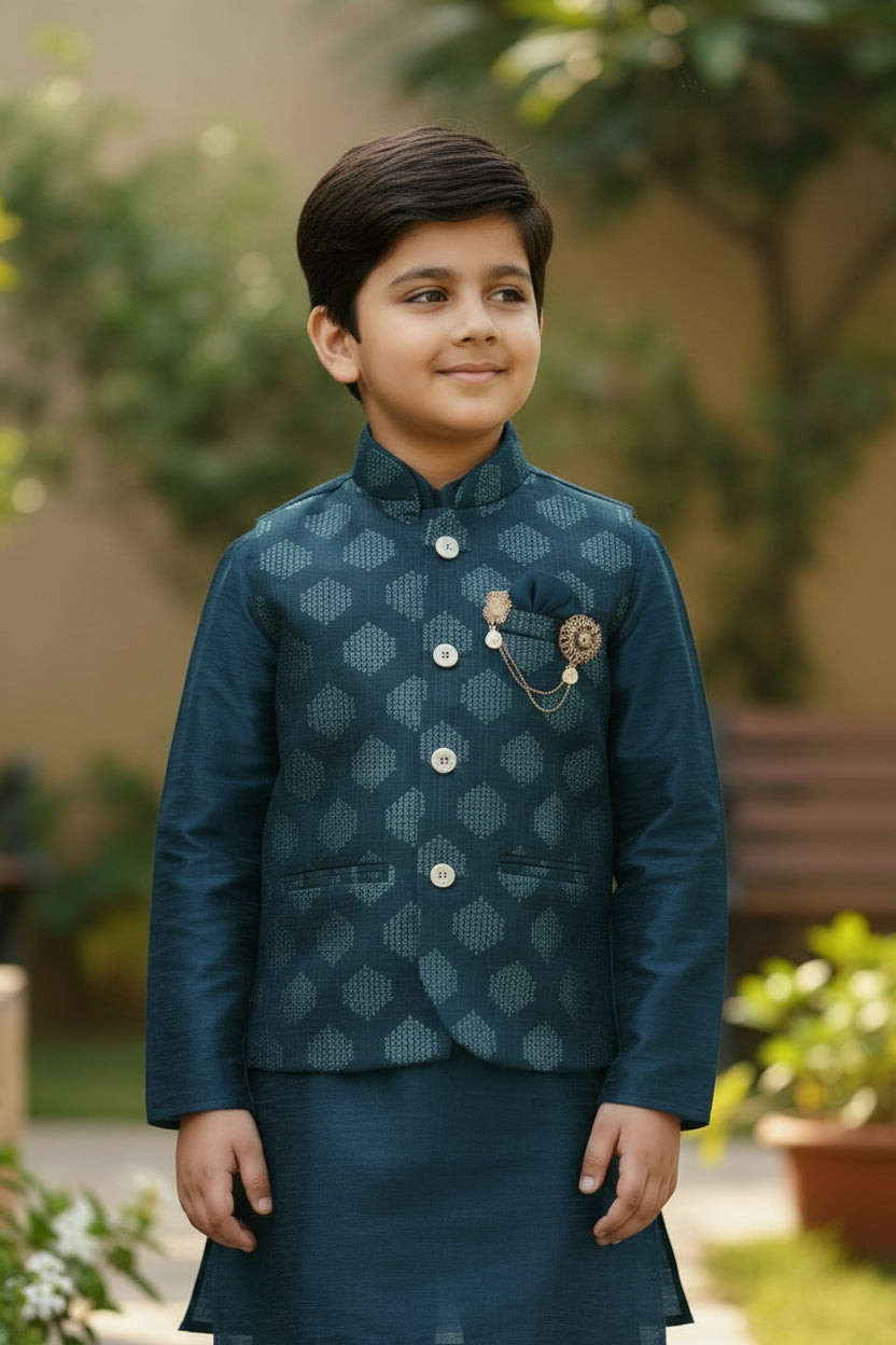 Immerse yourself in the enchanting allure of this Vibrant Kurta Jacket Set. This ensemble includes a Kurta, Pyjama, Jacket, Pocket Square, and Pocket Pin. Perfect for any occasion, it's time to impress with your dashing appearance.