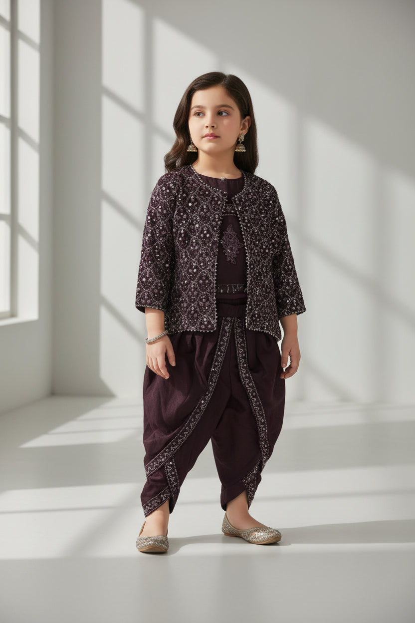 Celebrate in style with this stunning Dhoti Set that radiates festive elegance. Featuring rich hues, intricate accents, and a flowy drape, this ensemble effortlessly graceful look at weddings, celebrations, and special occasions.