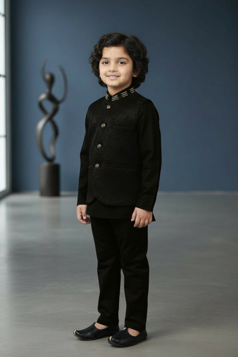 Embrace the grandeur of weddings with this Indo Western Set. Exuding elegance through its stunning jacquard fabric, this ensemble guarantees a strikingly regal look. Perfect for all occasions.