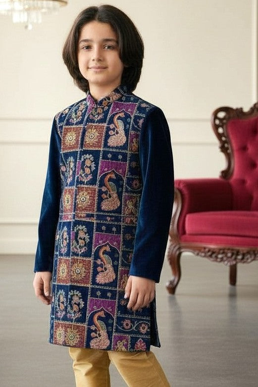 Emanate royal elegance in this Royal Set. The deep shade infuses a touch of luxury, perfect for grand celebrations. The ensemble includes a suit, pant, and a coordinating embroidery, amplifying the regal allure. Ideal for your modern gentleman who appreciates traditional styles with a contemporary twist.