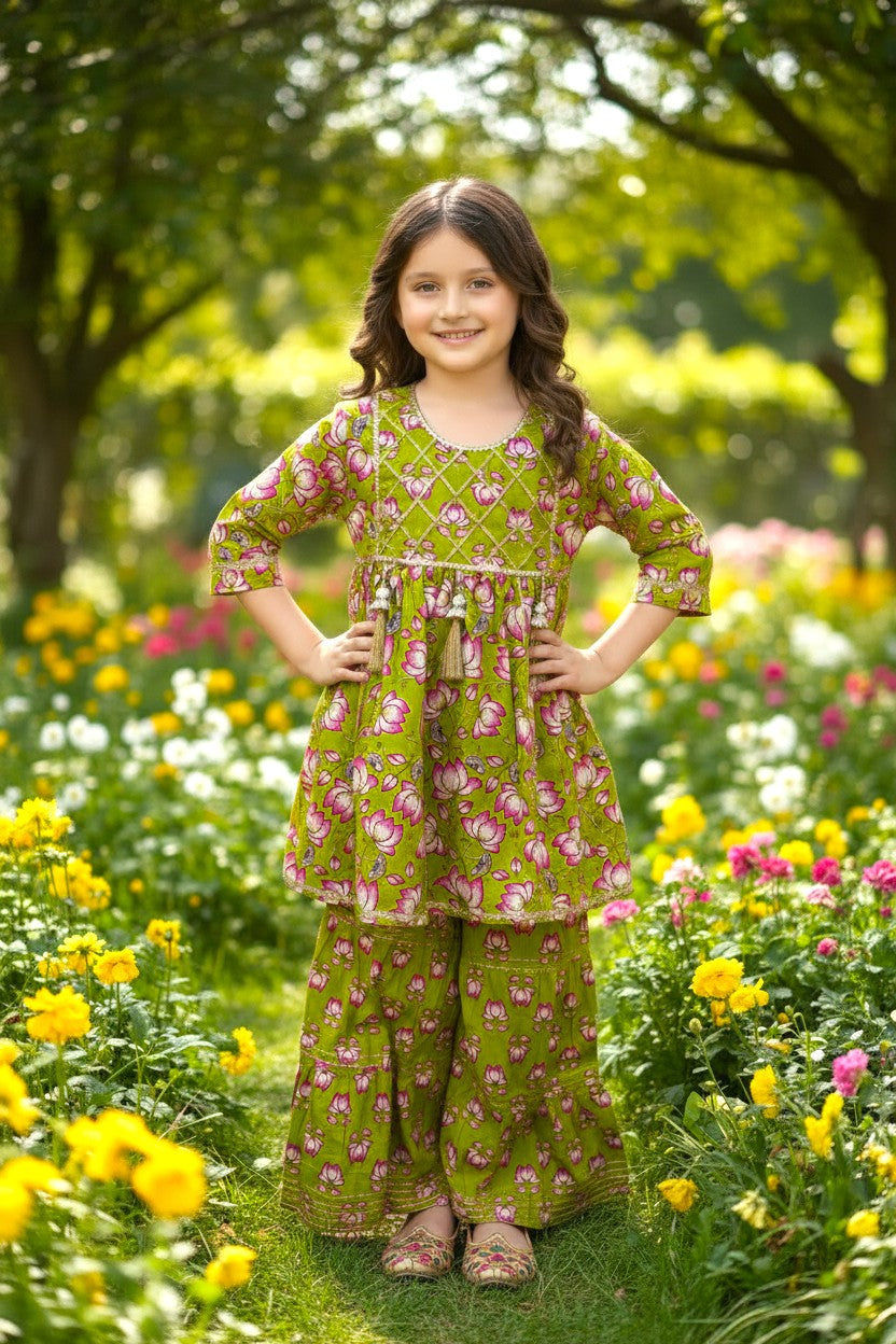 Add a vibrant touch to your girl’s wardrobe with this beautifully crafted Cotton Sharara Set, designed for effortless style and all-day comfort. Perfect for festive occasions, family gatherings, and casual celebrations, this ensemble blends traditional charm with breathable ease.