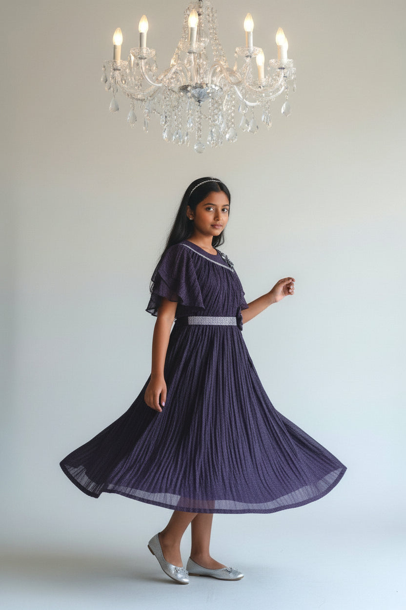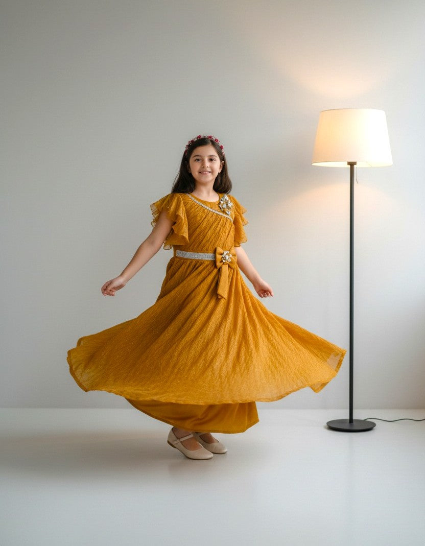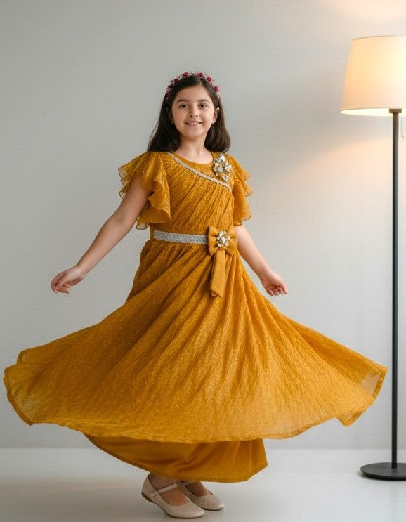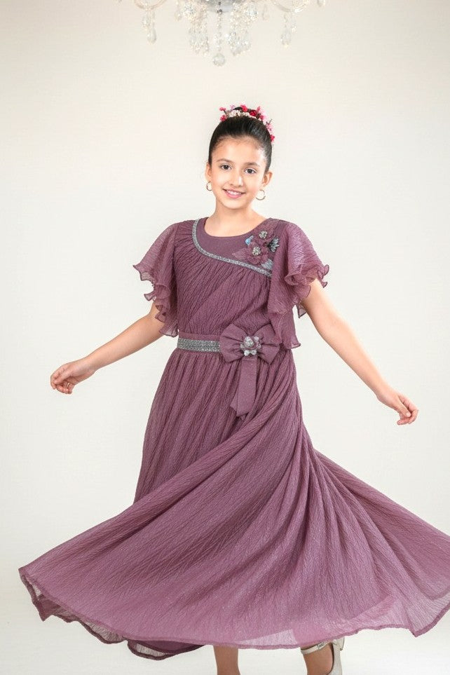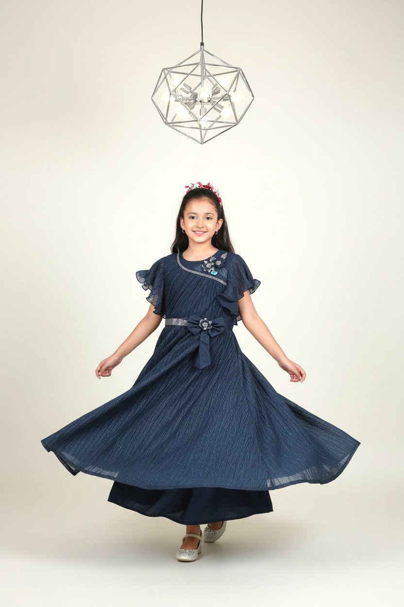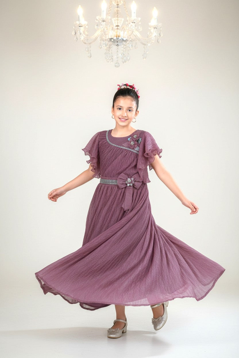 Let her shine effortlessly in this glamorous long gown that blends shimmer with comfort.